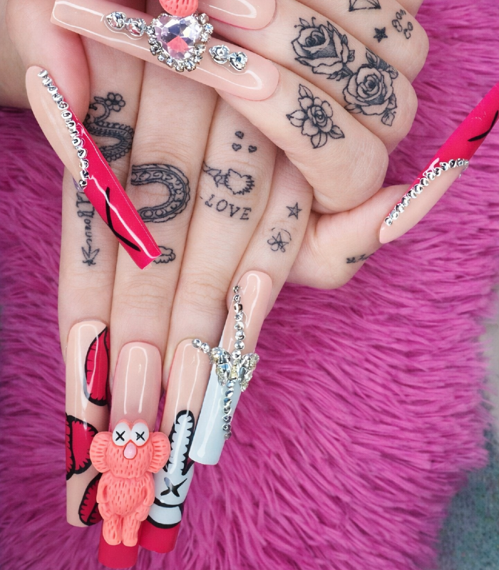 • Layout: Each nail features a unique combination of painted art, charms, or chains for a perfectly balanced custom look.