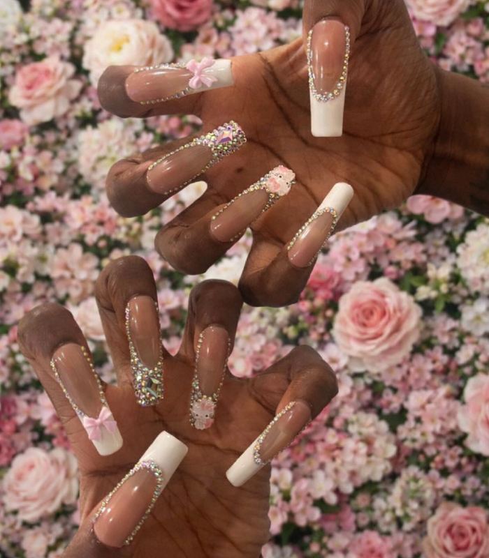 A statement nude-and-white long square set featuring crystal borders, bows, and character accents for a high-impact glam finish