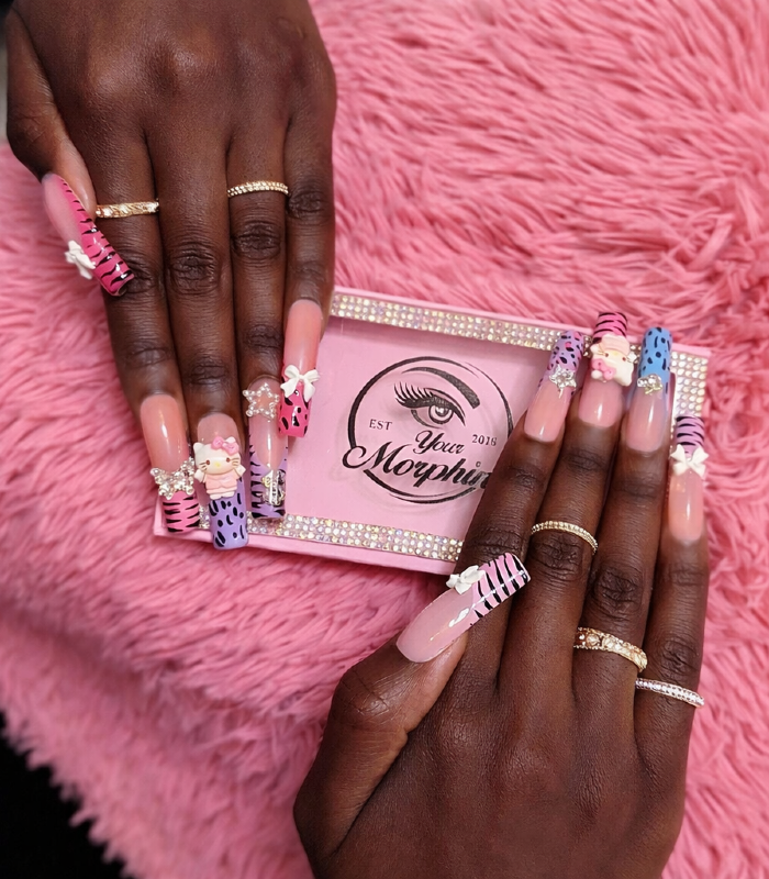 A statement long square set featuring character charms, bows, and bold patterns for a fun, high-impact finish